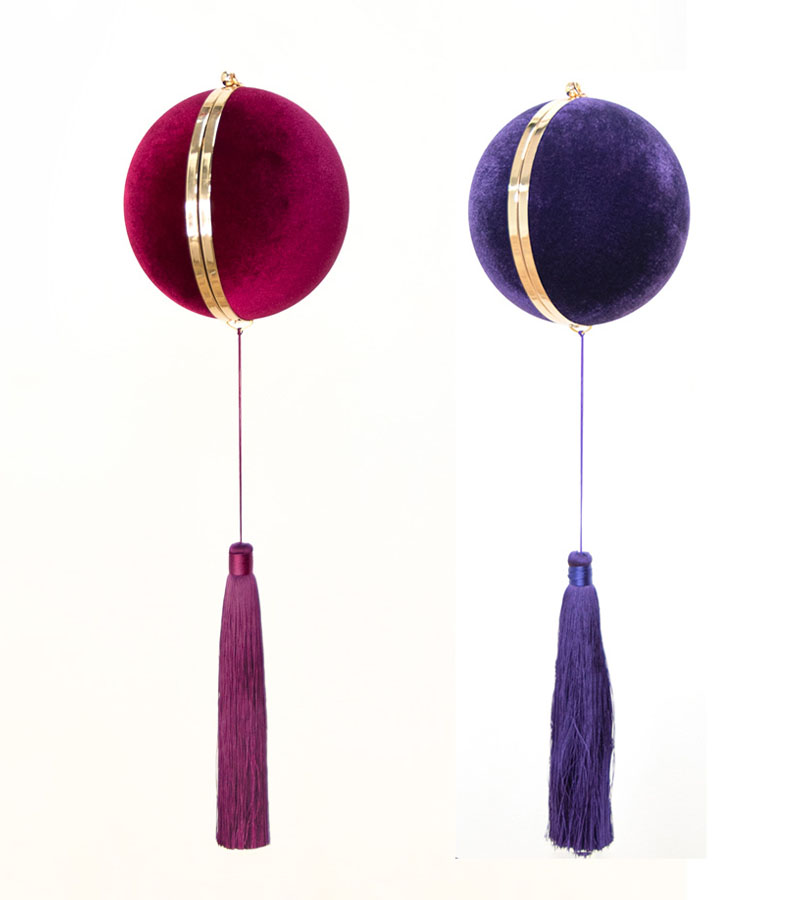 Bolso bola de terciopelo con borlón grande de seda con cadena, un toque único de distinción.