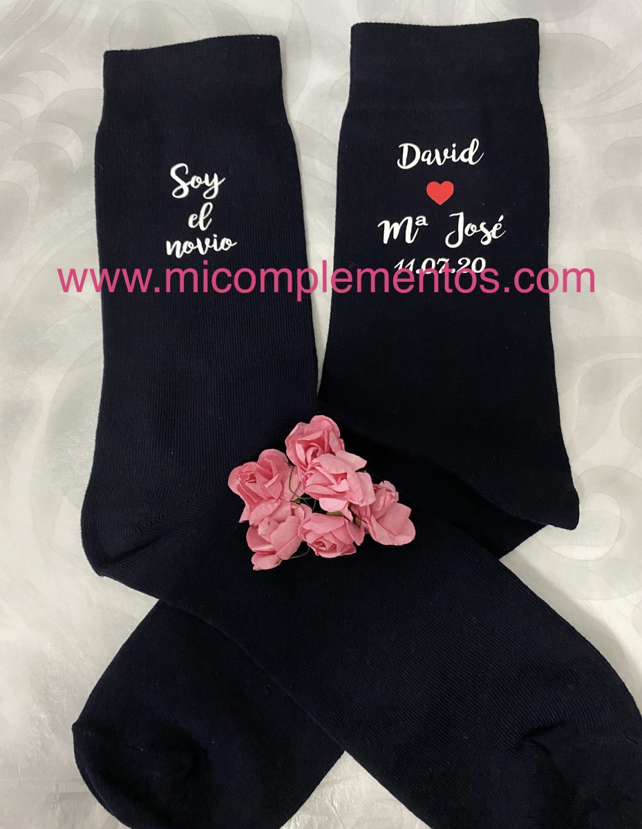 Calcetines de color negro, gris oscuro o azul marino personalizados con nombres y fecha de la boda en uno de los calcetines separados por un corazón rojo y frase a elegir en el otro calcetín.