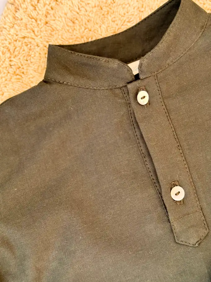 El color verde pino liso, característico de la colección Abeto, es fácil de combinar con pantalones, petos o ranitas, permitiendo crear looks coordinados con hermanos y hermanas. Una camisa versátil, pensada para el día a día o para momentos especiales.