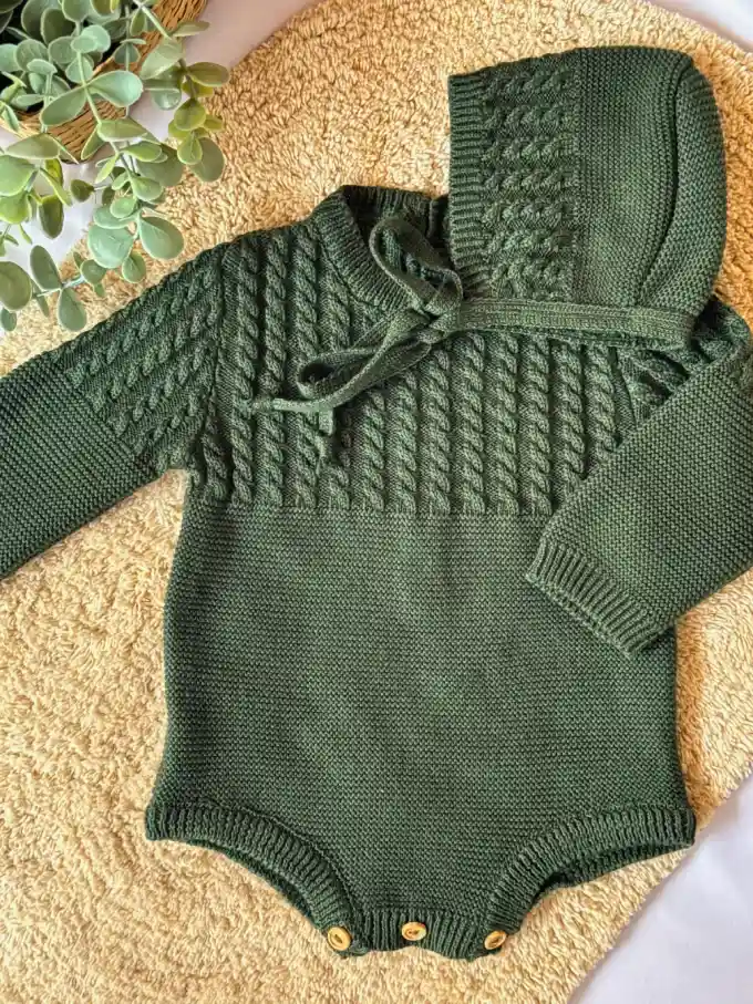 🌿 Tejido natural y delicado | 🎨 Color verde pino versátil | 🧵 Detalles artesanales en ochitos | 👶 Talla ideal para recién nacidos y bebés hasta 6 meses
