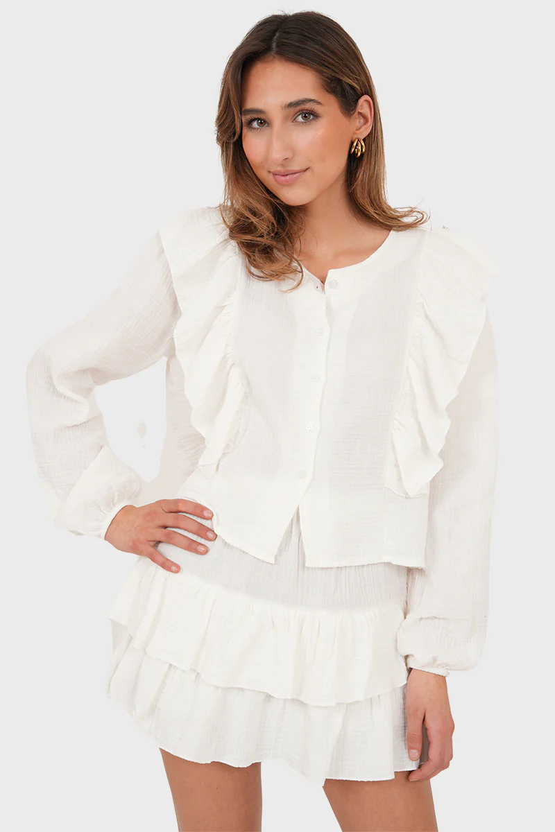 Deze witte blouse is gemaakt van heerlijk zacht materiaal en voelt super luchtig aan, perfect voor warme dagen. Maak je look compleet met het bijpassende rokje voor een set die eindeloos te combineren is. Verkrijgbaar in verschillende zomerse kleuren. Style met laarsjes, je favoriete tas en je bent helemaal ready to shine.