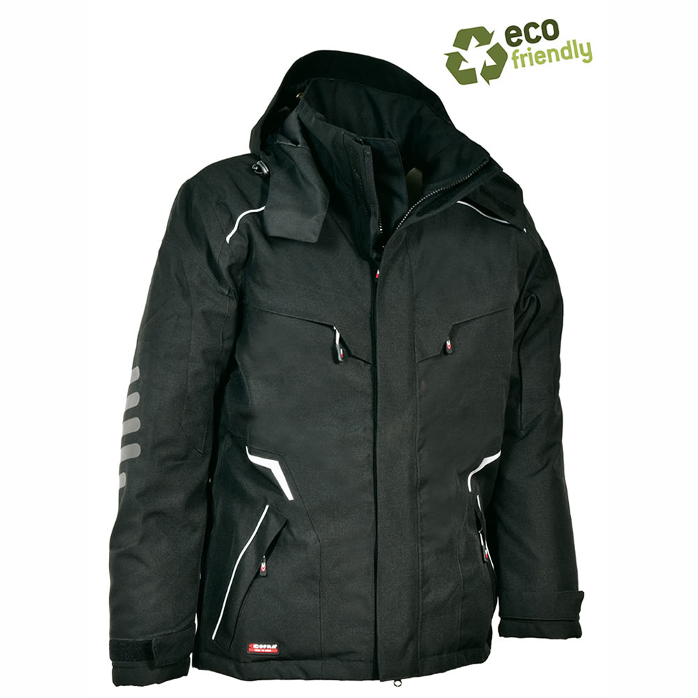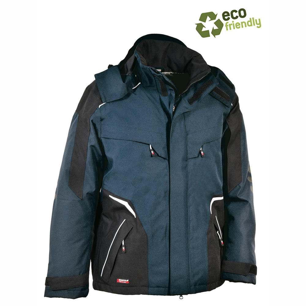DESCRIPCIÓN: 1 bolsillo en la manga izquierda con cierre de cremallera, 2 amplios bolsillos bajo de la prenda con cremallera, 2 bolsillos en el pecho, uno de los cuales es un soporte para teléfono celular con E-WARD, 2 bolsillos interiores uno con cierre de cremallera, acolchado técnico de bajo volumen con alto aislamiento térmico para una excelente retención de calor, bajo de la prenda ajustable con cordón, capucha ajustable y despegable, corte ergonómico de las mangas, costuras termoselladas, inserto forro interior aluminizado, insertos de goma antiabrasión en los codos, insertos reflectantes, puños regulables con velcro, tejido con trama ripstop