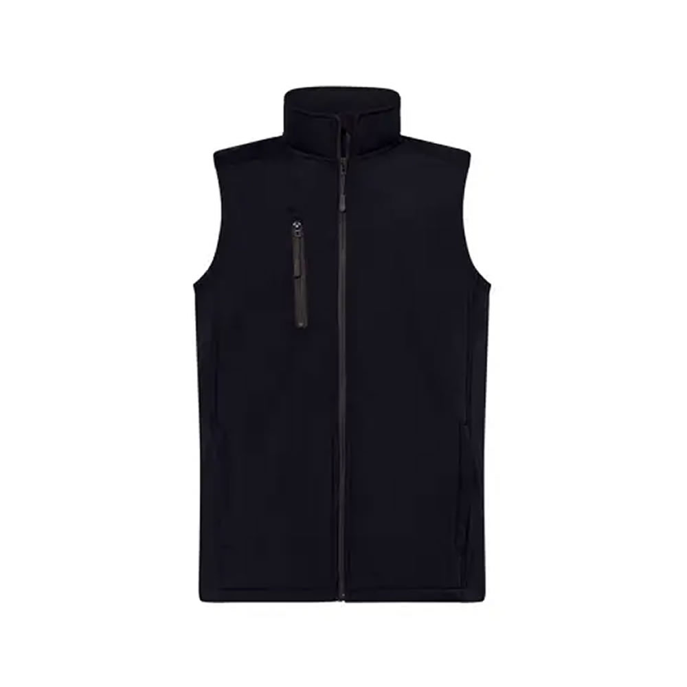 Chaleco ergonómico de dos capas y tratamiento hidrorrepelente, con cremallera larga, dos bolsillos laterales con cremallera, un bolsillo en el pecho, cordón en la cintura.