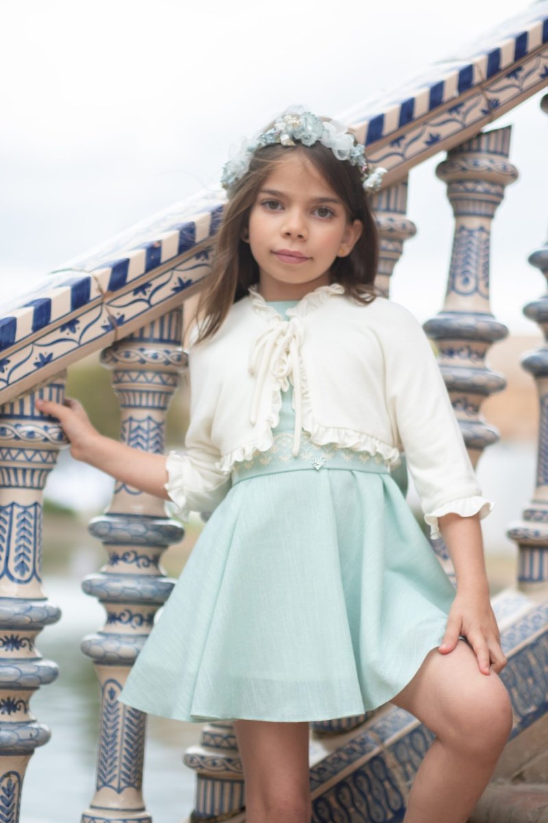 Chaqueta de punto para niña en color beige, ideal para acompañar vestido de ceremonia.