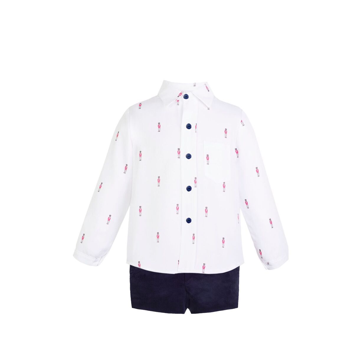 Conjunto para niño Colección BRITISH 2 piezas, compuesto por camisa de algodón manga larga con estampado soldaditos ingleses sobre fondo blanco, abotona por delante con botones azul marino. Pantalón corto azul marino. Combínalo con el jersey de punto en color azul marino de la misma colección.