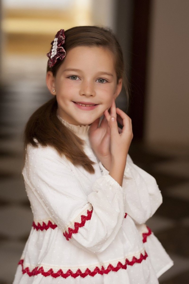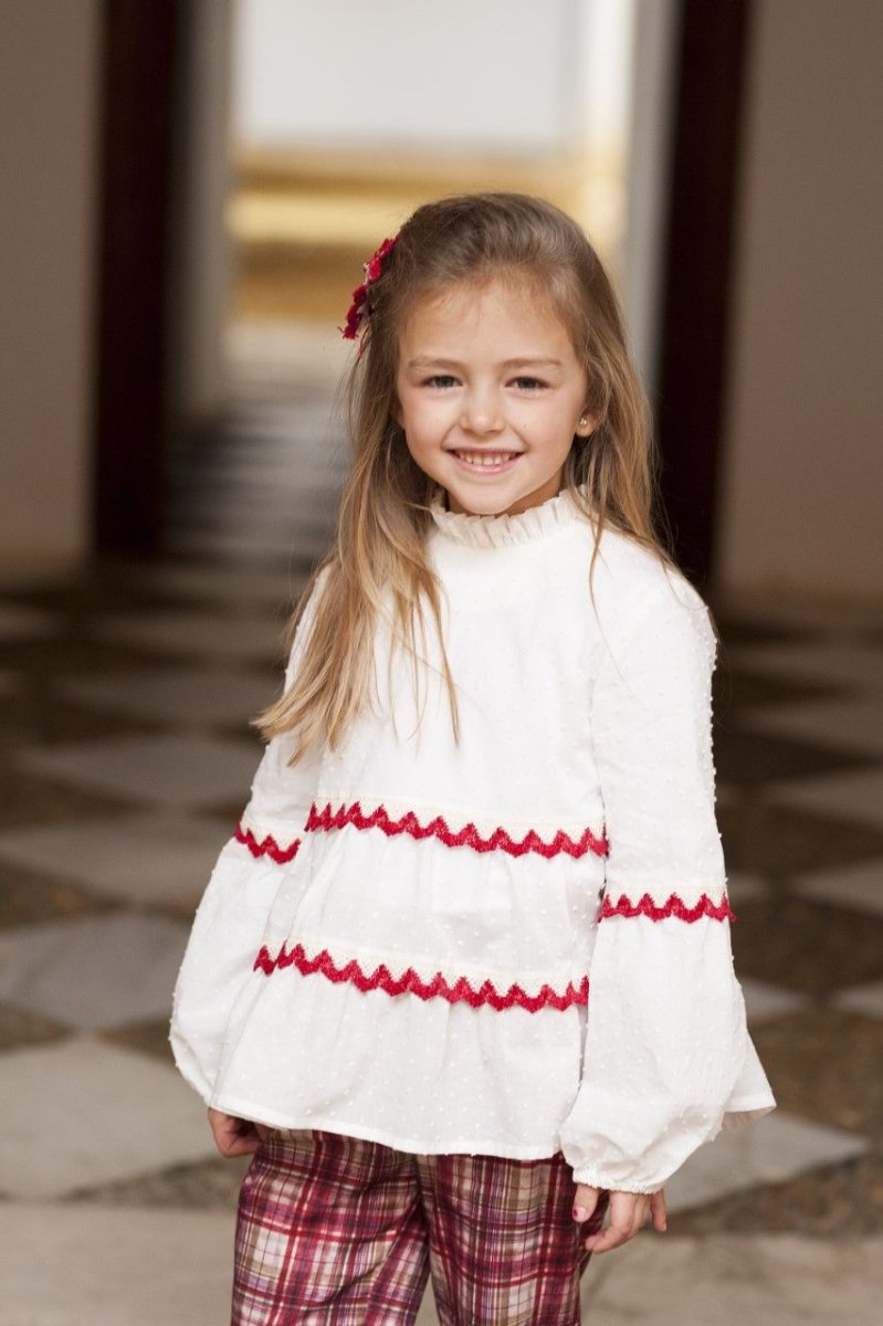 Conjunto para niña 2 piezas compuesto por camisa color blanco crudo en plumeti corte evasé y dos remates de tiras de ondas en color rojo burdeos y manga engomada. Pantalón corto bombacho con estampado de cuadros burdeos y blanco.. Ajustable en cintura. Forro interior.