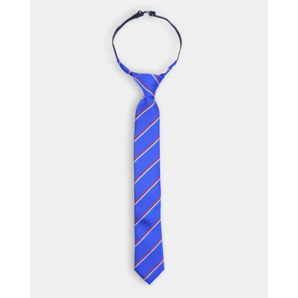 Corbata para niño en color azul klein con estampado rayas en color rojo combinado con azul celeste. Lleva goma autoajustable en el cuello, para no tener que hacer el nudo, que ya viene hecho.