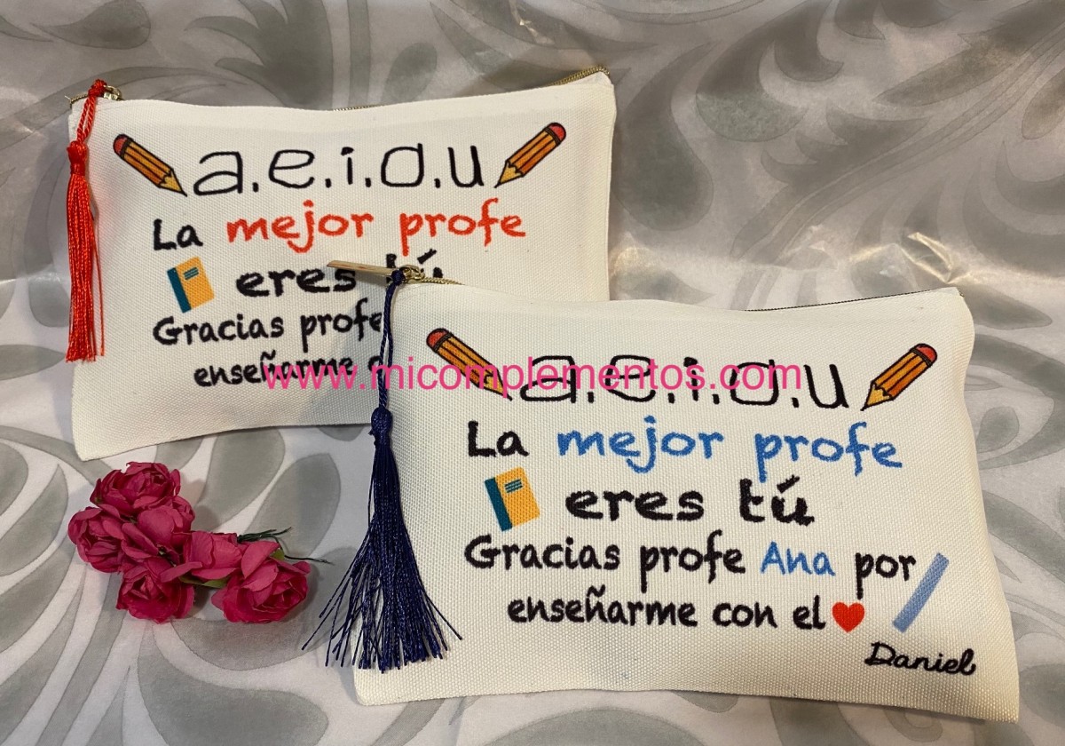 Neceser con aspecto de algodón personalizado para sorprender a los profesores. Está disponible en dos diseños diferentes y se personaliza con el nombre del profesor o profesora, con los colores que nos digas y con el nombre del alumno si se quiere en la parte inferior derecha.