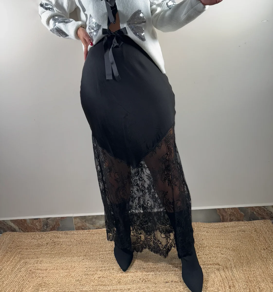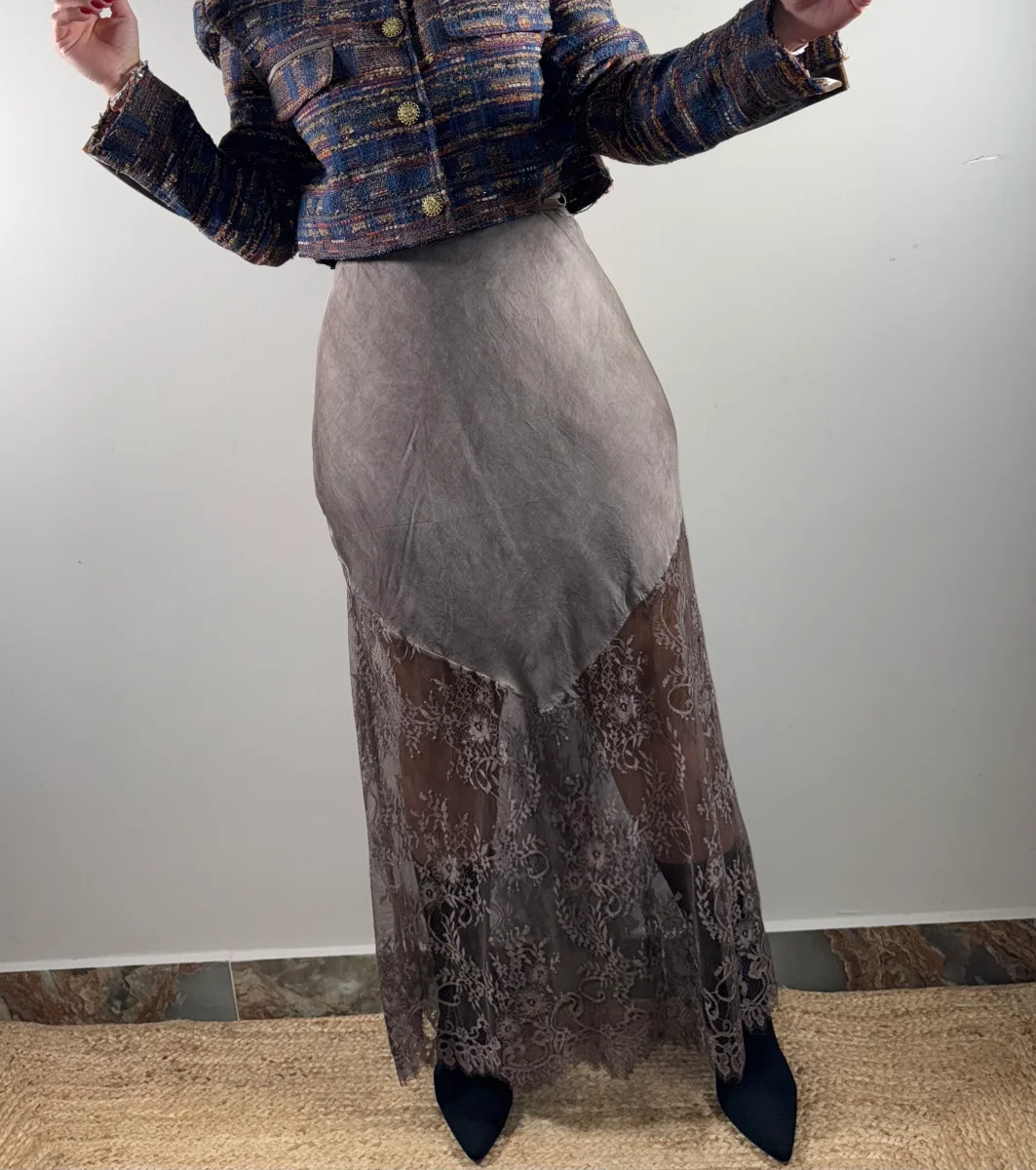 FALDA SATINADA CON ENCAJE, EN VARIOS COLORES.