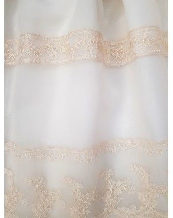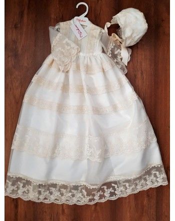 Impresionante faldón artesanal en color crudo de estilo clásico, con manga francesa confeccionado en Organza y Tul y bordado con delicados encajes de puntilla de valencie. La capota a juego lleva también el mismo bordado y un lazo en color tostado a juego.