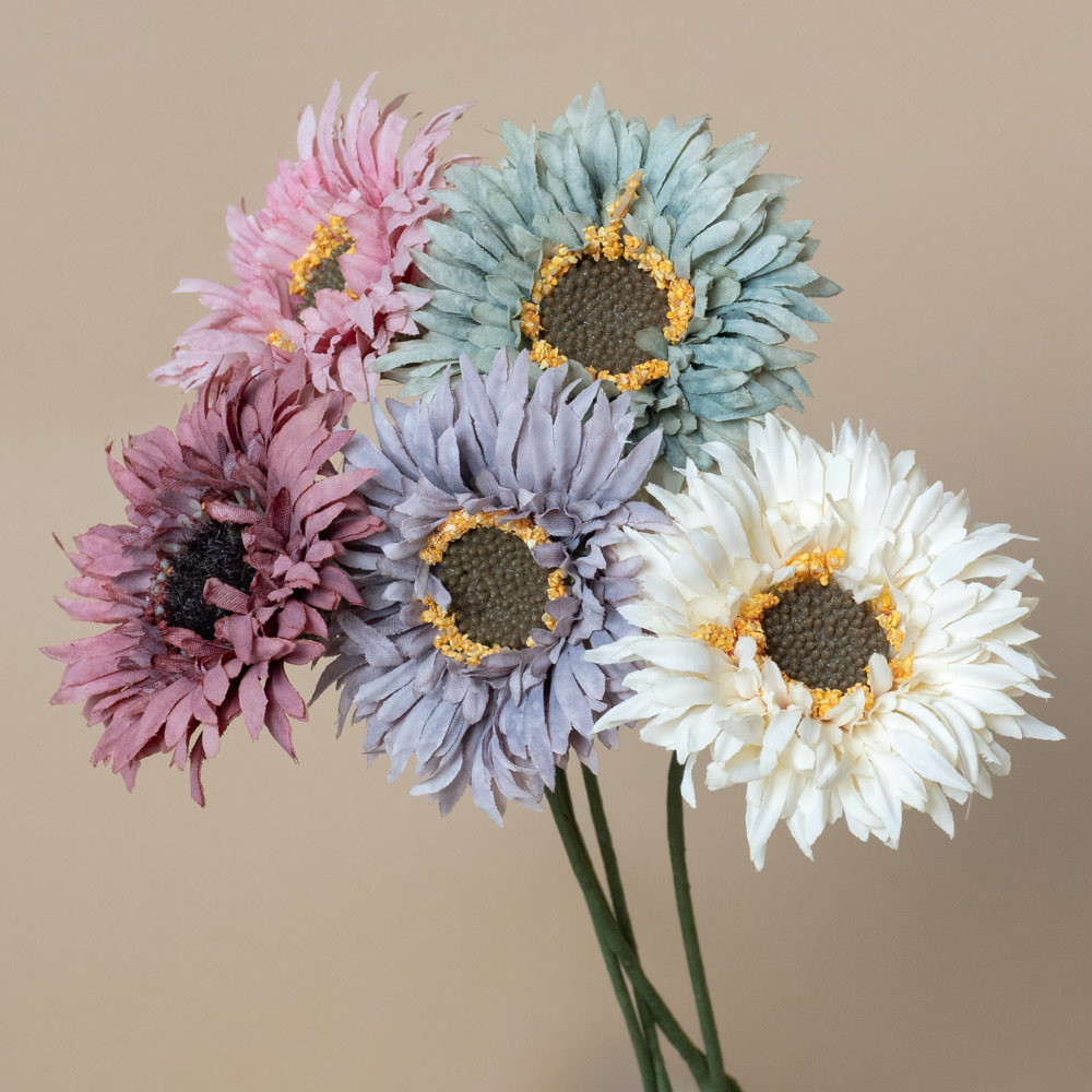 Las margaritas son flores silvestres y como tal, son perfectas para romerías, pero últimamente han cobrado mucho protagonismo porque es tendencia máxima llevar flores colocadas de mayor a menor o en el recogido por detrás sueltas y su tamaño es perfecto para eso y sus colores ideales para combinar con los bordados de los mantones que también llevan tonos muy empolvado.