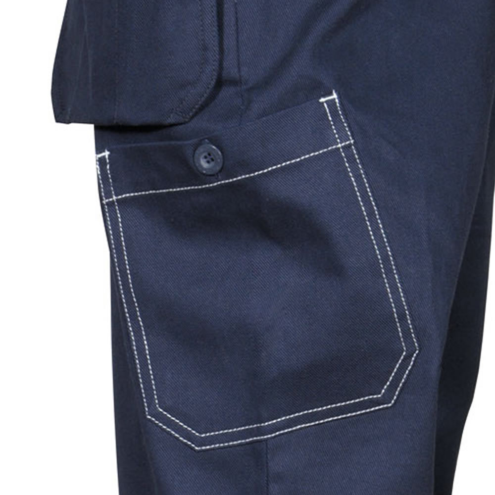 DESCRIPCIÓN: bolsillo para rodilleras con posición ajustable, amplios bolsillos delanteros, bolsillo lateral izquierdo con cierre con botón, bolsillo porta metro, bolsillo trasero con cierre con botón, bolsillos exteriores portaclavos, cintura elástica, pantalón con abertura central cierre de botones.