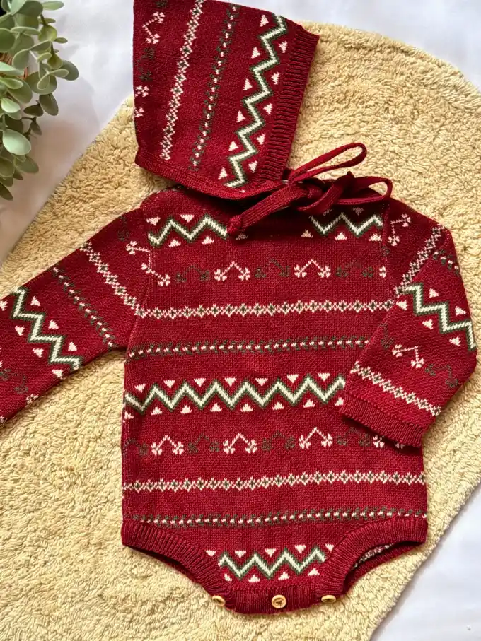 El Pelele Acebo Burdeos es una pieza que celebra la magia del invierno con un aire sofisticado y acogedor. Tejido en punto 100% algodón en un profundo tono burdeos, este pelele destaca por su diseño cálido y original, ideal para las celebraciones navideñas y los paseos invernales. Su jacquard exclusivo en tonos verde, crema y burdeos aporta textura y contraste, evocando los colores clásicos de la temporada. El diseño tipo gnomo navideño añade un toque de fantasía que convierte cualquier momento en una postal entrañable.