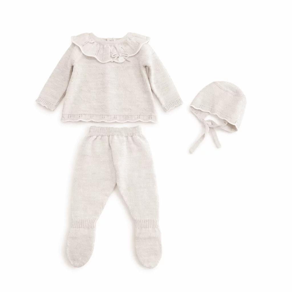 Esta primera puesta beige es un conjunto de tres piezas tejido en punto. Incluye:
