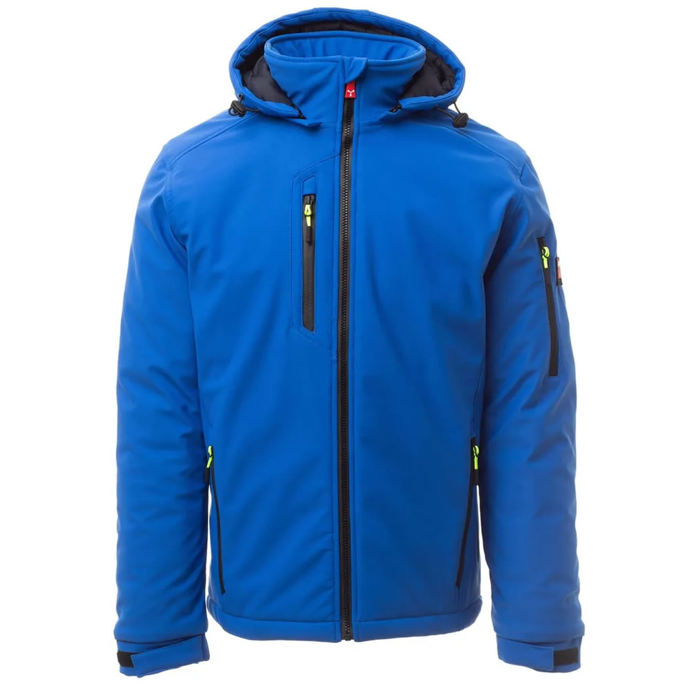 Soft-shell de tres capas, con acolchado cálido (160 g/m²), de hombre, cuello con inserciones de forro polar, cierre de cremallera SBS con cursor de metal con sistema de bloqueo semiautomático y tirador personalizado. Capucha desmontable, con cordón ajustable. Cuello interior con detalles de forro polar en los laterales. Bandas retrorreflectantes en el bajo de la espalda y en la parte posterior de la capucha. Puños elásticos ajustables con cierre de gancho y bucle. Dos bolsillos laterales con cremallera, un bolsillo en el pecho con cremallera recubierta y un bolsillo en la manga izquierda con alojamiento para bolígrafos integrado, cerrado con cremallera. Tiradores fluorescentes. Un bolsillo de ojal interior con cierre de gancho y bucle. Bajo ajustable con topes personalizados.