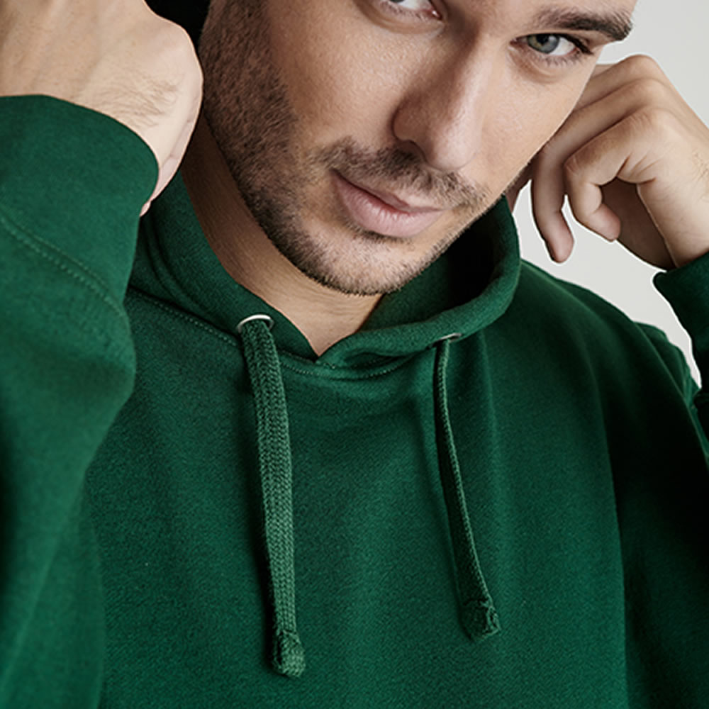 Sudadera capucha con bolsillo canguro y cordón ajustable. Puños y cinturilla de punto canalé 1×1 con elastano. Modelo de niño sin cordón.