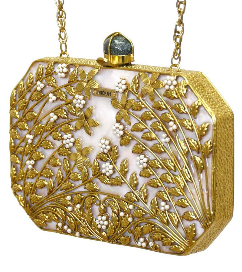 Bolso de nácar con diseño de flores en latón y perlas. Muy elegante y favorecedor.