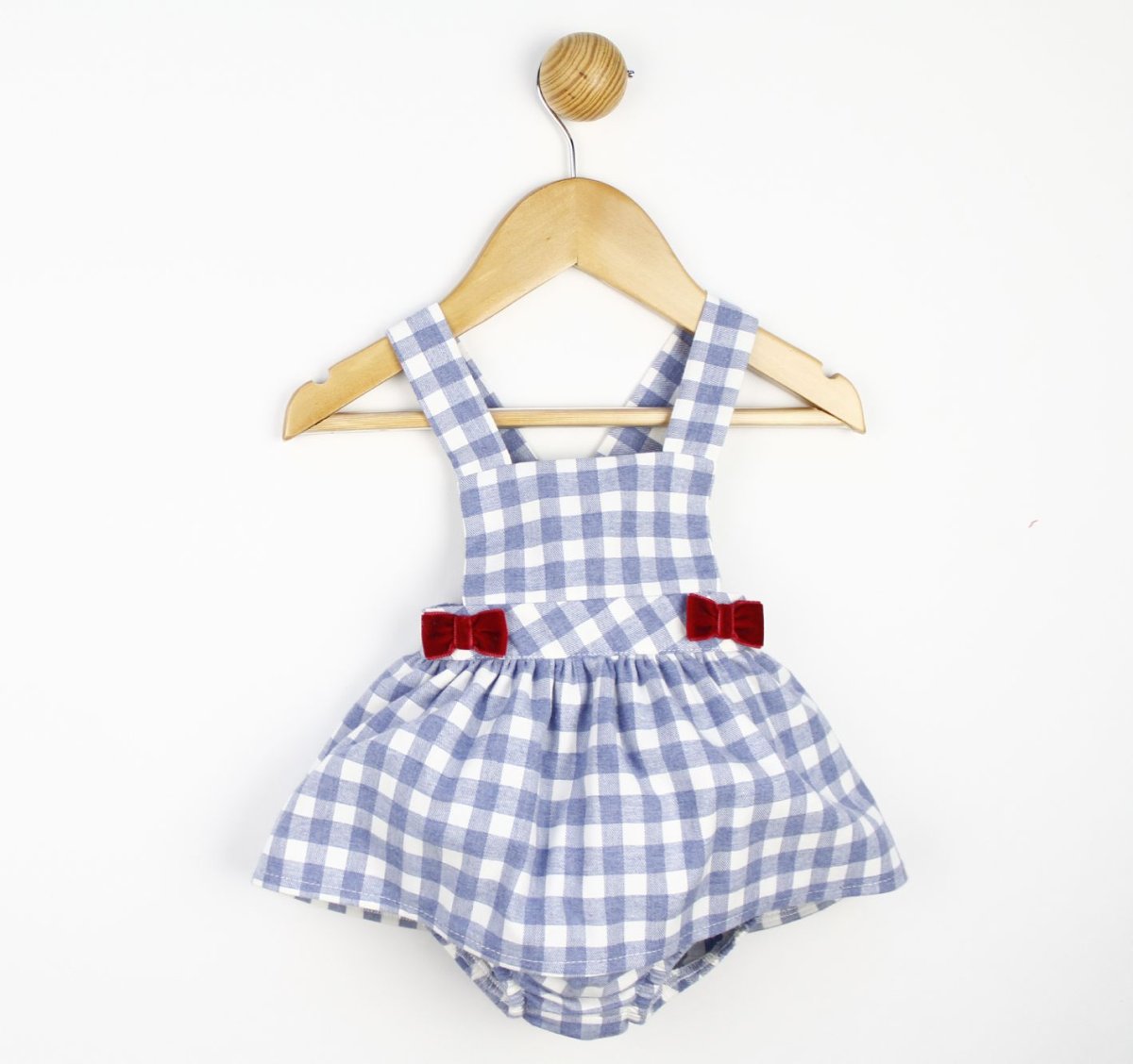 Vestido en peto para Bebé con estampado de cuadros vichi en color azul y blanco, lleva dos lacitos rojos en la cintura en cada lado. Braguita a juego que lleva elástico en las piernas.