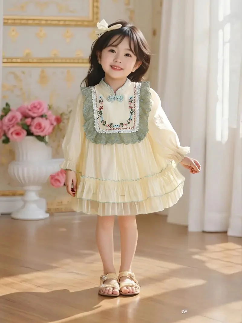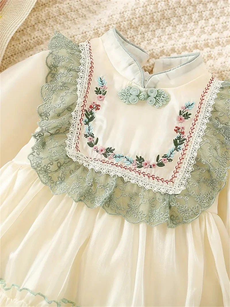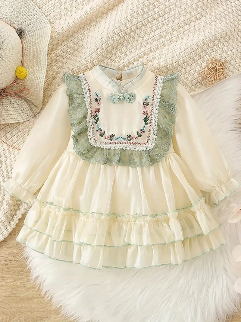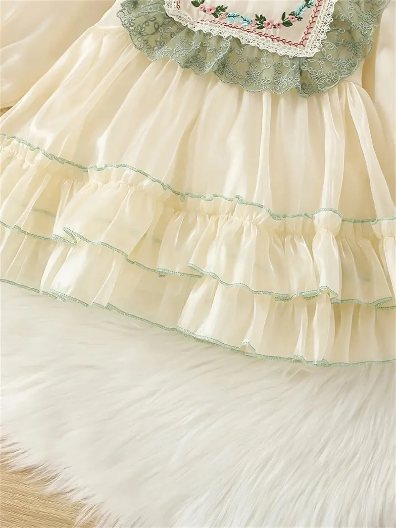 Déjate enamorar por este vestido de inspiración vintage, ideal para niñas que irradian dulzura y elegancia. Con detalles bordados, volantes delicados y encaje en tonos verdes, es la opción perfecta para ocasiones especiales, sesiones de fotos o celebraciones familiares.